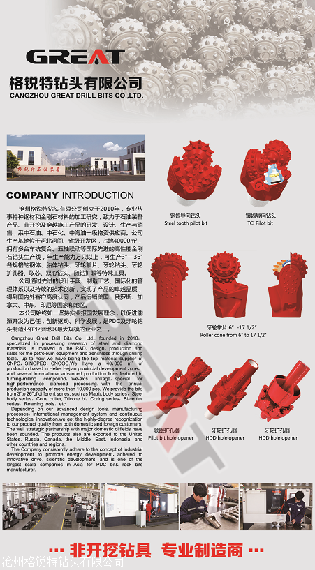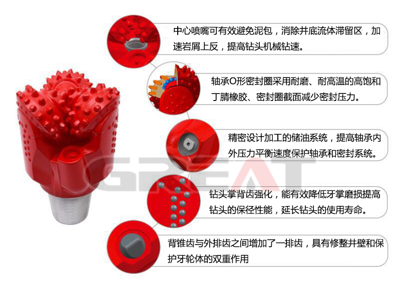 组装后的钻头由四个或更多的锥体构成,主切削齿使用新型耐磨合金型钢齿和优质硬质合金齿焊接而成,导向钻头为三锥钻头,适用于大直径表面钻井和矿山钻井以及根基工程钻井。